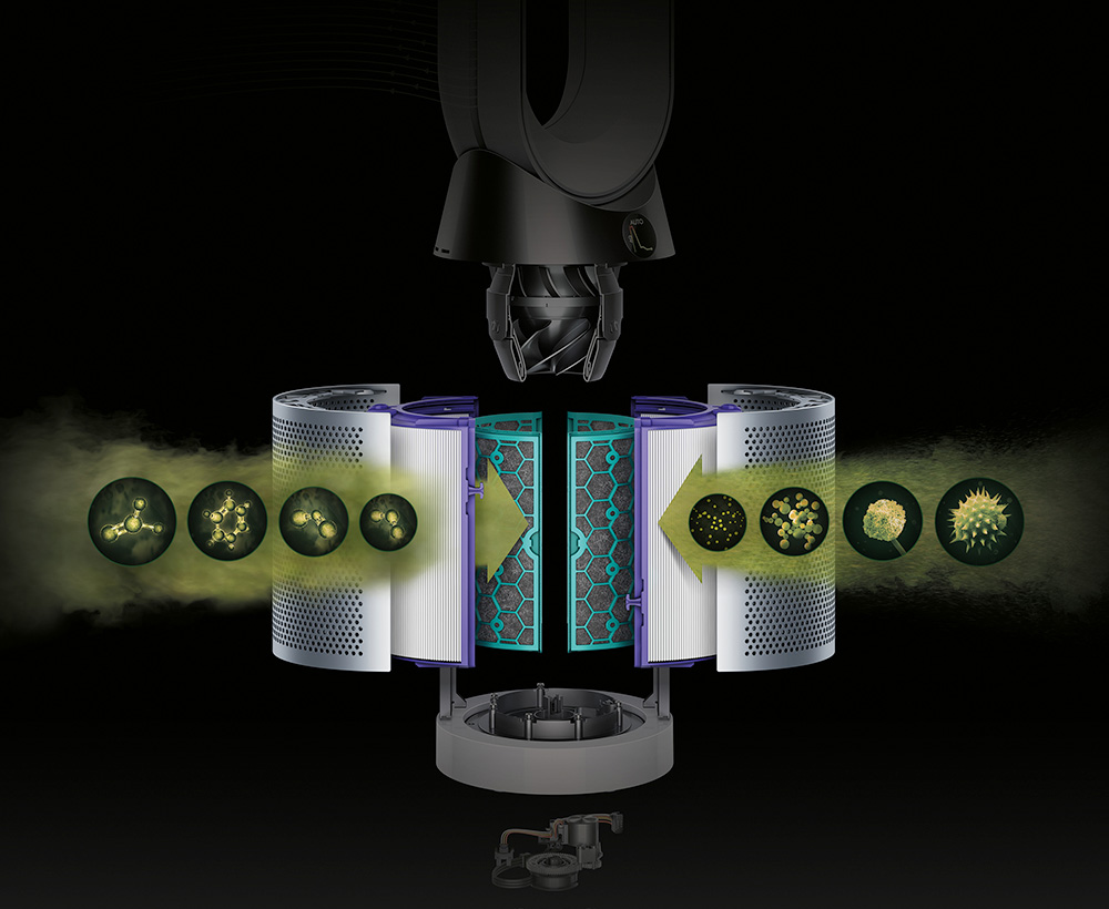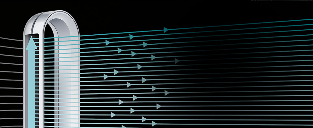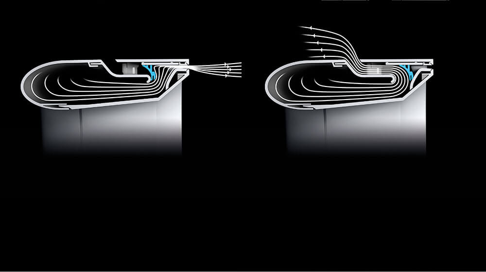 A terelőlemez előretolódik így elzárja az elülső nyílást és 45°-os szögben körben a fej hátsó részére irányítja a levegőt, így szórt légáramlást hoz létre. Ez kevesebb energiafogyasztással és halkabb működéssel jár, mert ez a nyílás szélesebb. A tisztítási hatékonyság változatlan, azonban erős légmozgás nélkül.